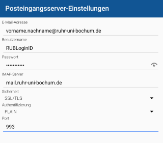Posteingangsserver: mail.ruhr-uni-bochum.de Verschlüsselung: SSL Port: 993